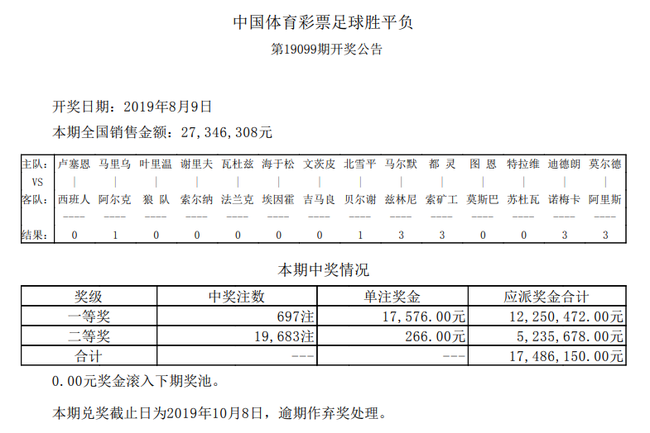 北京时间8月9日,胜负彩第19099期开奖结果揭晓。本期一等奖开出697注,单注奖金1.7万余元;二等奖开19683注266元;任九本期开38810注217元。本期胜负彩销量为27,346,308元,任九投注总额为13,202,418元。