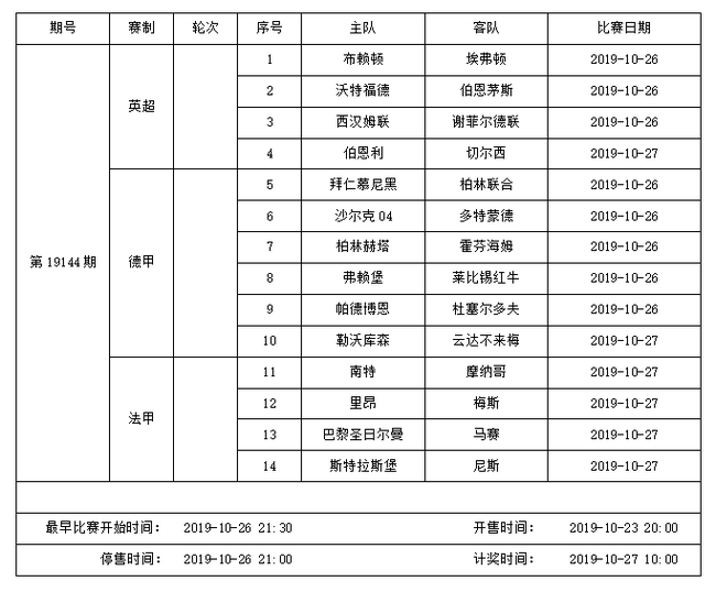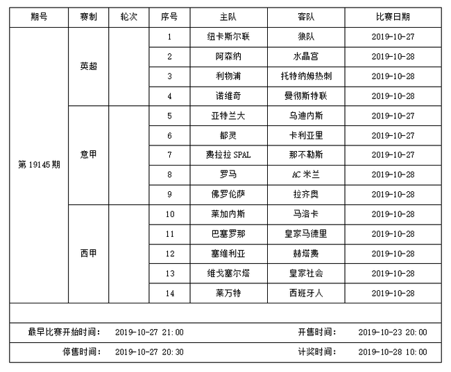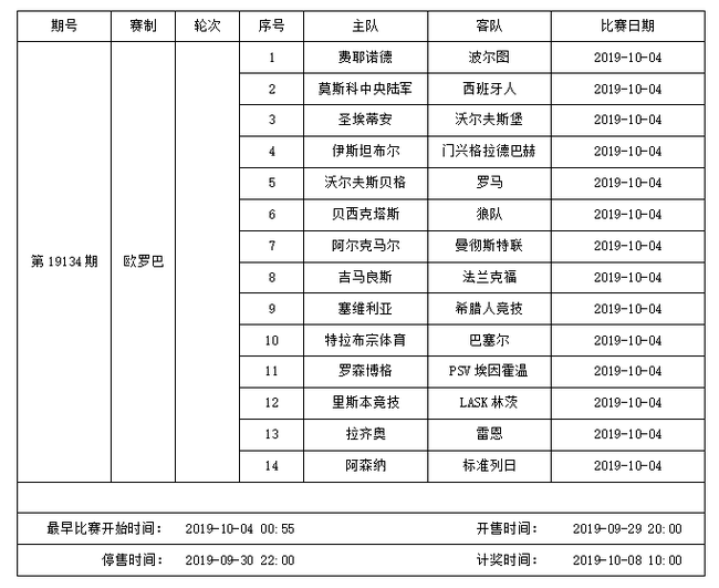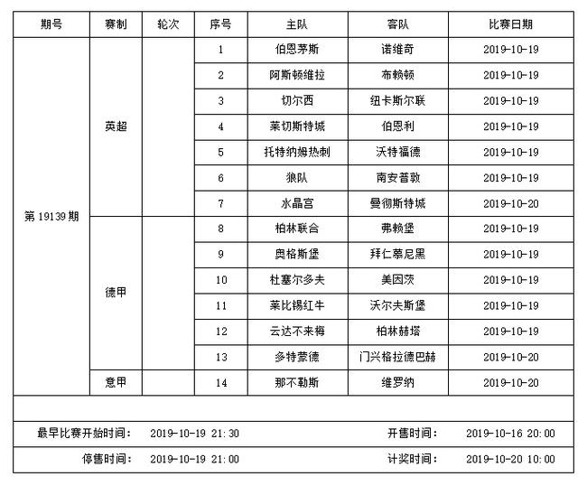 中国足球彩票14场胜负彩2019年10月竞猜场次安排