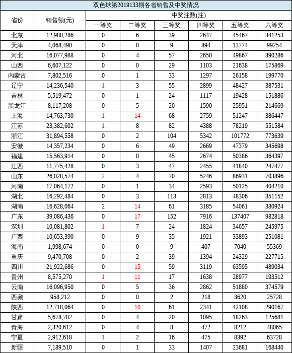 当期全国销量为4.12亿元。广东(不含深圳)当期双色球销量为3908万多元,高居第一;浙江以3189万多元的销量位列第二;山东以2602万多元排名第三;江苏以2338万多元排名第四;四川则以2192万多元排名第五。计奖结束后,双色球奖池余额为9.97亿元。