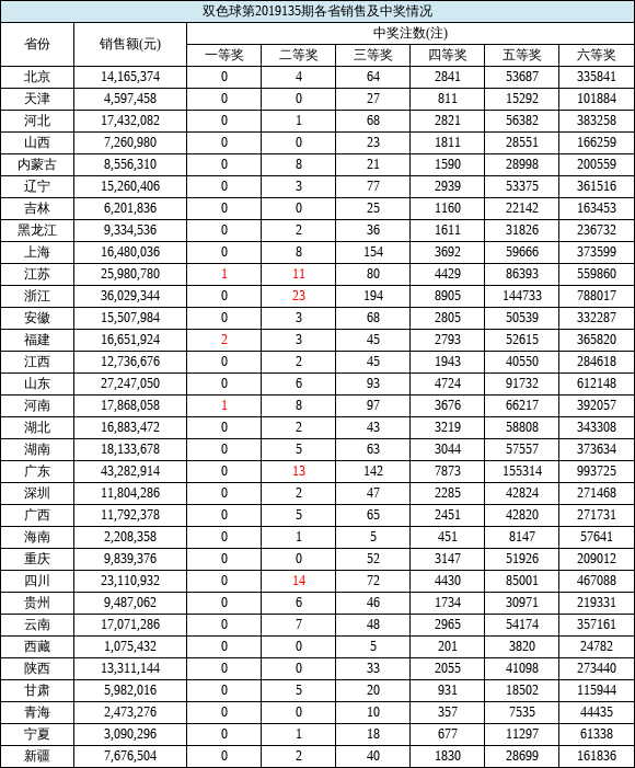 本期二等奖开出145注22.7万,其中浙江中出23注最多,四川14注、广东13注、江苏11注,其他地区均在10注以下;六等奖开出990万注,其中六等奖翻番奖552万注。