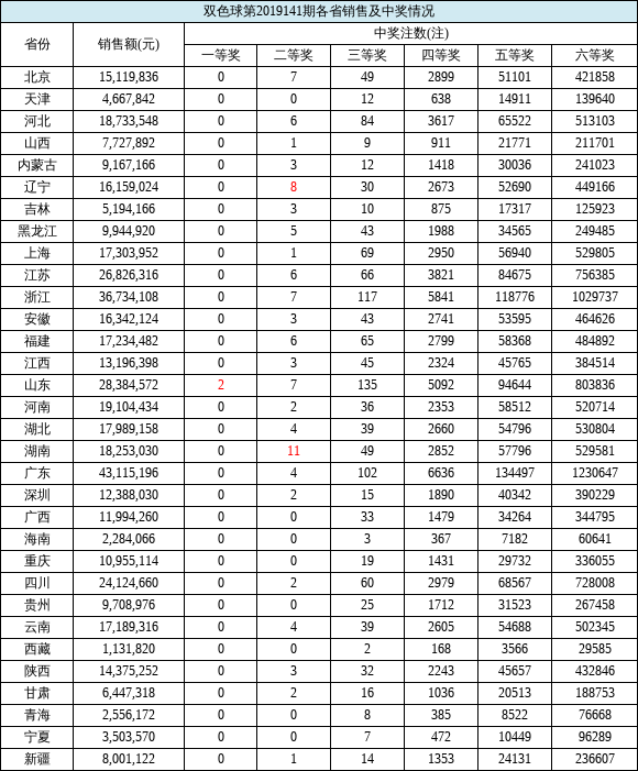 22:50 本期一等奖开出2注1000万,2注均中得一等奖特别奖,各多获得1000万元,花落山东。若为一人中得,则该彩民揽获4000万大奖。本期二等奖开出101注,单注奖金31.7万元,其中湖南中出11注,辽宁揽获8注,其他地区均在8注以下;六等奖开出1331万注,其中六等奖翻番奖860万注。