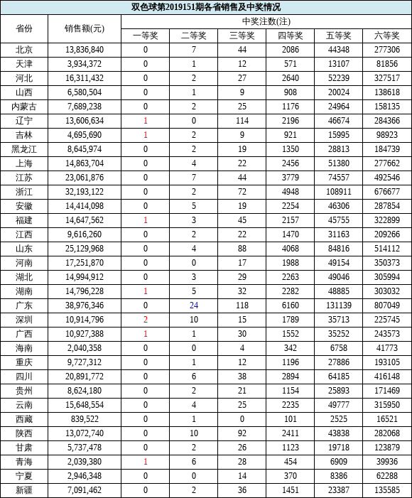 当期全国销量为4.05亿元。广东(不含深圳)当期双色球销量为3897万多元,高居第一;浙江以3219万多元的销量位列第二;山东以2512万多元排名第三;江苏以2306万多元排名第四;四川则以2089万多元排名第五。计奖结束后,双色球奖池余额为8.55亿元。