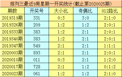 三、体彩排列三前9周星期一奖号分别开出:331-209-383-383-549-893-011-728-061,其中号码012路比为14:6:7,奇偶比为16:11,大小比为10:17;