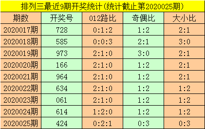 一、排列三第2020025期开出号码424,其奇偶比为0:3,大小比为0:3,号码012路比为0:2:1。该号码直选历史上出现了8次。