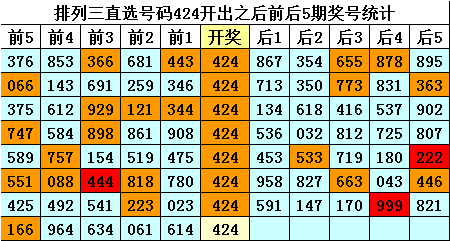 四、排列三直选号码424历史上开出8次,其前后五期奖号分别为: