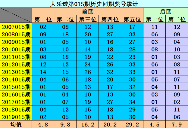 历史号码分析:在大乐透第015期同期奖号中前区连码出现概率为31%,同尾号出现概率为62%。后区第一位1、2路出现概率为69%,第二位0、2路出现概率为77%。