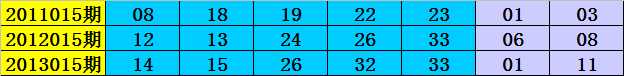 在2011015期-2013015期同周期奖号中,前区连码出现3期,同尾号出现2期,号码奇偶比6:9,大小比10:5,号码012路比6:3:6,前区开出13个号码。