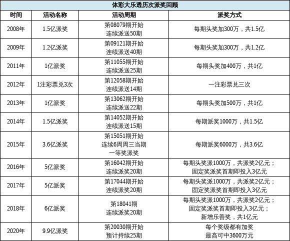 大乐透自2007年上市至今,已走过13个年头。2007年05月28日,大乐透首期开售。第一次派奖活动在2008年展开,距今已有12年了。在这12年间,大乐透一共开展过11次(含本次)派奖活动,详情如下表所示: