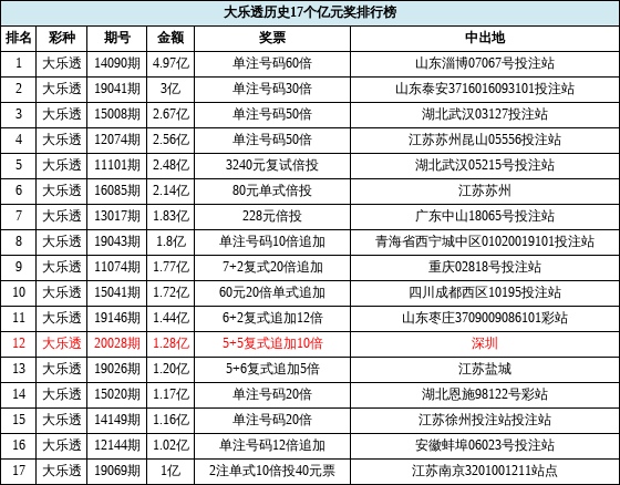 以下表格为大乐透亿元奖排行榜: