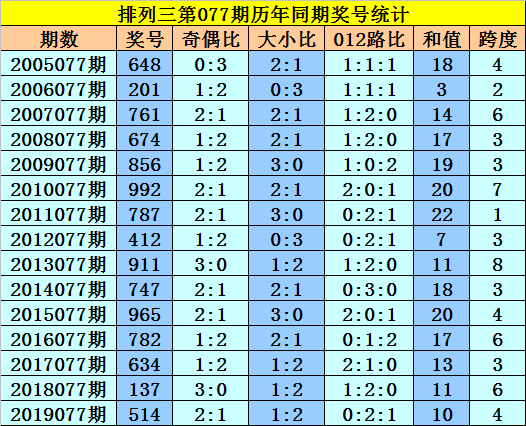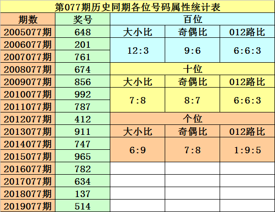 第077期历史同期开奖中,百位号码振幅分别为:4-5-1-2-1-2-3-5-2-2-2-1-5-4,波动范围在1-9之间,012路号码比例开出6:6:3,大小号码比例开出12:3,奇偶号码比例开出9:6,本期预计百位开出奇数号码,参考号码9。