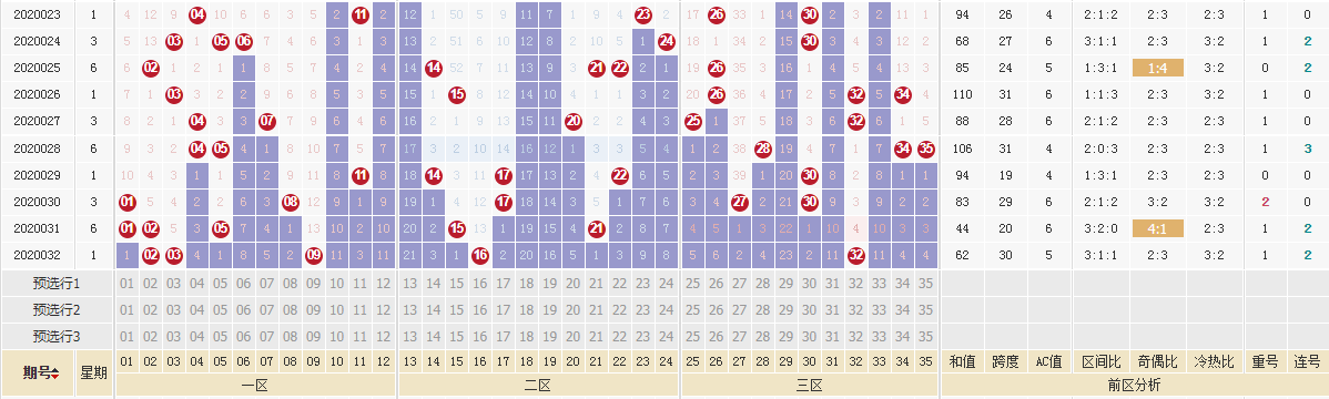 三区比:上期前区三区比为3:1:1,本期看好第三区热出,参考比例1:2:2,。