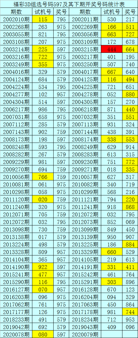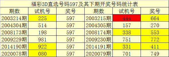 一、开奖回顾:第2020078期福彩3D试机号为080,奖号为597。奖号奇偶比为3:0,和值为:21,跨度为:4。