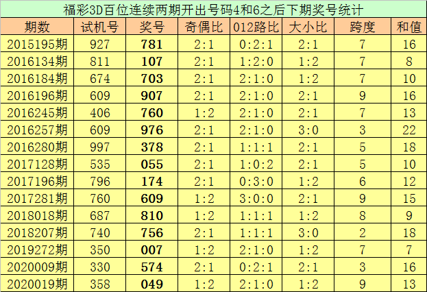 百位号码:连续两期百位出号分别为:4-6,历史上福彩3D连续两期前后分别出号4-6的奖号共出现58次。在百位4-6的奖号现象出现时,近15期下期分别出号:781-107-703-907-760-976-378-055-174-609-810-756-007-574-049;