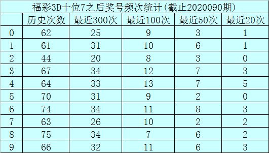 十位杀号:上期十位奖号为7,历史上十位奖号7共出现647期,前100次十位开出奖号7时,其下期0-9奖号频次分别为:奖号4开出13次,3开出12次,6、9开出11次,1、7开出10次,0、5开出9次,2开出8次,8开出7次。