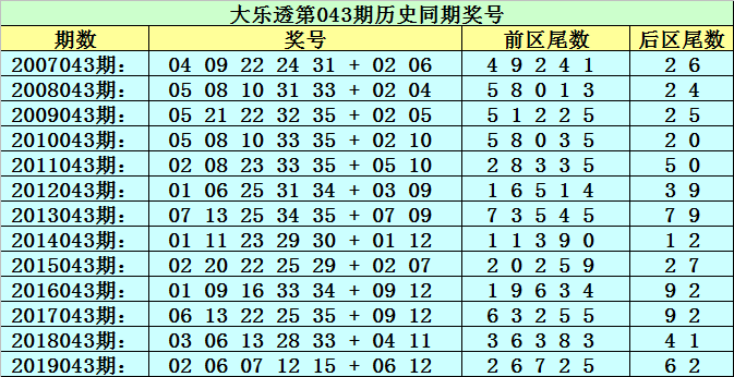 李太阳大乐透第2020043期历史同期后区尾数看号