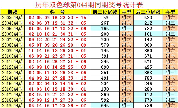 在历年同期开奖中,前三位尾数分别为:259 267 166 208 930 579 146 391 346 690 351 491 234 130 869 592 646,其中组六号码出现比例相对较低,仅出现了15次,今年同期适当关注组六号码开出,在前三位尾数中,大尾号码出现频次较少,今年同期预计前三位大尾逐渐转热,关注尾数2、8、9,参考红球:02 08 09。