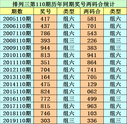 排列三从2004年开奖至今已开出5516期奖号了,其中第110期历史同期奖号出现15次,历年第110期分别开出号码:417、437、786、393、944、813、351、704、164、475、824、772、815、746、303。