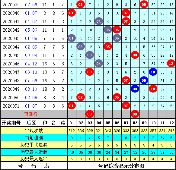 后区历史同期尾数频次分别为:尾数0127出现4次、尾数5出现3次、尾数39出现2次、尾数468出现1次,尾数奇偶比为15:11,大小比为11:15,012路比为9:9:8,质合比为17:9,本期后区参考尾数3、8,关注两码03、08。