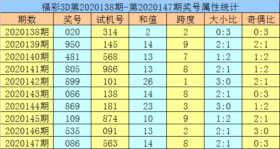 福彩3D第2020147期开出试机号563,奖号086。奖号形态为组六,奇偶比为0:3,012路比为2:0:1,大小比为2:1,和值为14,跨度为8。