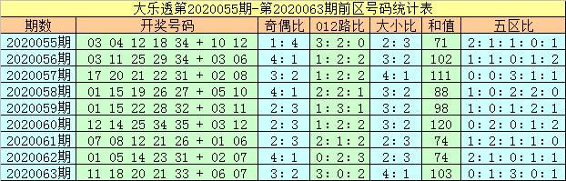 大乐透第2020063期奖号为:11 18 20 21 33 + 06 07,其中前区奇偶比3:2,012路比3:0:2,大小比4:1,和值103,五区比0:1:3:0:1。