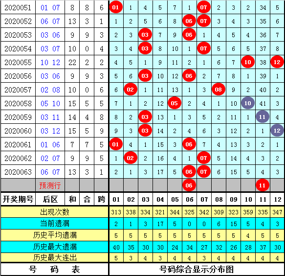 5、后区分析:上期后区奖号为:06和07,开出小大组合和偶奇组合,本期看好大小号持平,预计奇偶号平衡,两码看好06、11。