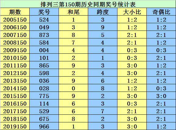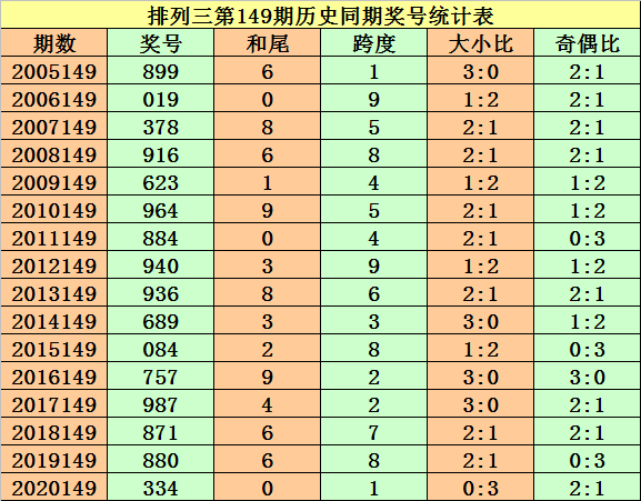 和尾推荐:排列三第150期历史同期,和尾大小比开出8:7,012路比开出7:4:4,奇偶比开出7:8,奖号和尾开出期数分别为:和尾 9→3期,和尾1、2、6、8→2期,和尾0、3、4、7→1期,和尾5→0期,本期适当关注小和尾出现,参考和尾3。