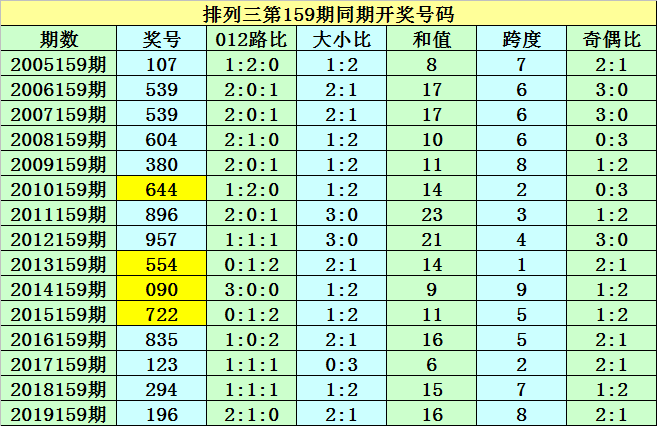 本期为排列三第2020159期开奖,开奖日期为:2020年7月27日,历史上排列三第159期已开出了15次奖号,历年同期开出号码分别为:107-539-539-604-380-644-896-957-554-090-722-835-123-294-196。