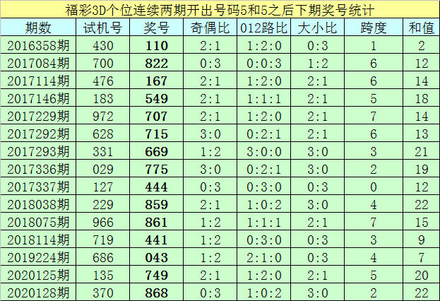 个位号码:最近两期个位开出号码为5-5,在福彩3D历史开奖中,前后两期个位分别开出号码5-5的奖号出现了71次。最近15期个位5-5组合出现之后,其下期奖号分别为:110-822-167-549-707-715-669-775-444-859-861-441-043-749-868;