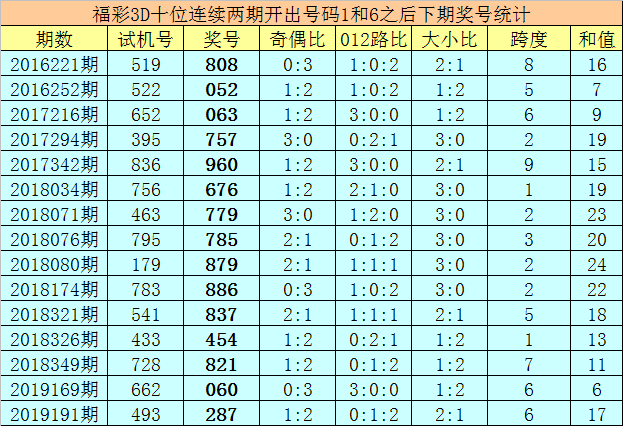 十位号码:前两期十位分别出现奖号1-6,历史上福彩3D连续前后分别开出号码1-6的现象共开出68次。在十位1-6的现象出现时,最近15期其下期分别开出号码:808-052-063-757-960-676-779-785-879-886-837-454-821-060-287;