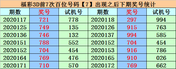 在百位号码7前7次开出之后,其下期分别开出号码:2、9、9、7、9、9、7,其中号码奇偶比为6:1,大小比为6:1,012路比为4:2:1。