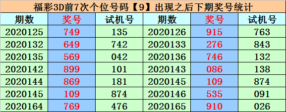 在最近个位奖号中,号码9前7次开出之后,下期分别落号:5、6、6、6、9、5、0,其中奖号大小比为6:1,012路比为5:0:2,奇偶比为3:4。