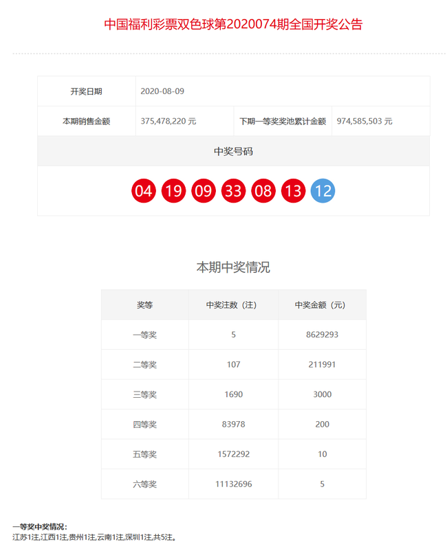 22:20 本期头奖开出5注,单注奖金862万,5注头奖分落5地,江苏、江西、贵州、云南、深圳各1注。二等奖开出107注,单注奖金21.1万。本期双色球销量3.75亿,计奖结束后奖池余额9.74亿。