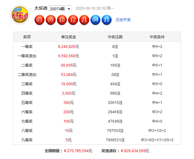 大乐透第2020074期奖号为03 09 10 12 21 + 04 11,前区号码奇偶比为3:2,大小比为1:4,和值为55,012路比为4:1:0;后区号码奇偶比为1:1,大小比为1:1。