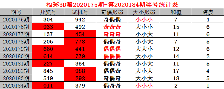 福利彩票3D第2020184期开奖结果011,试机号为379。奖号:偶奇奇、小小小,和值2,跨度1。