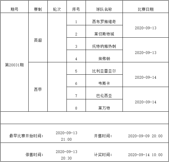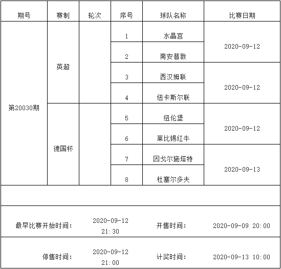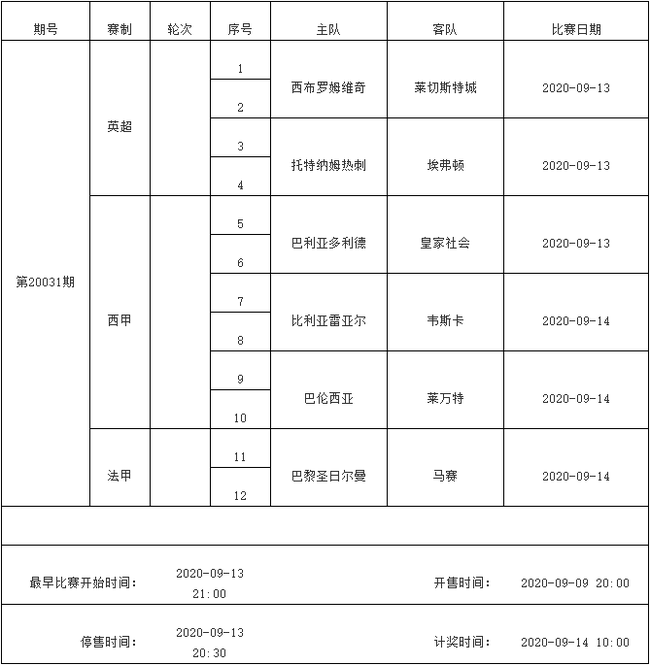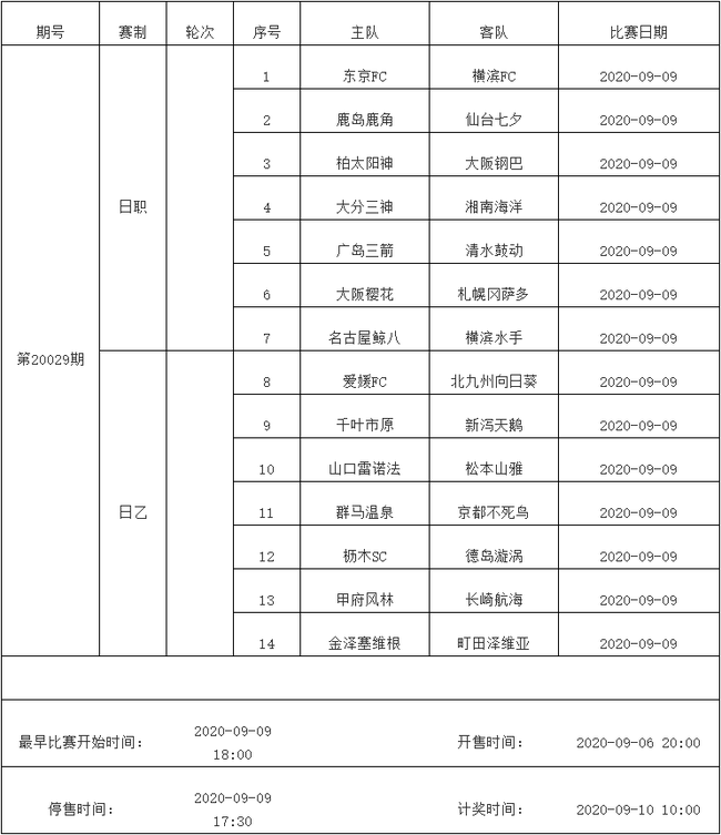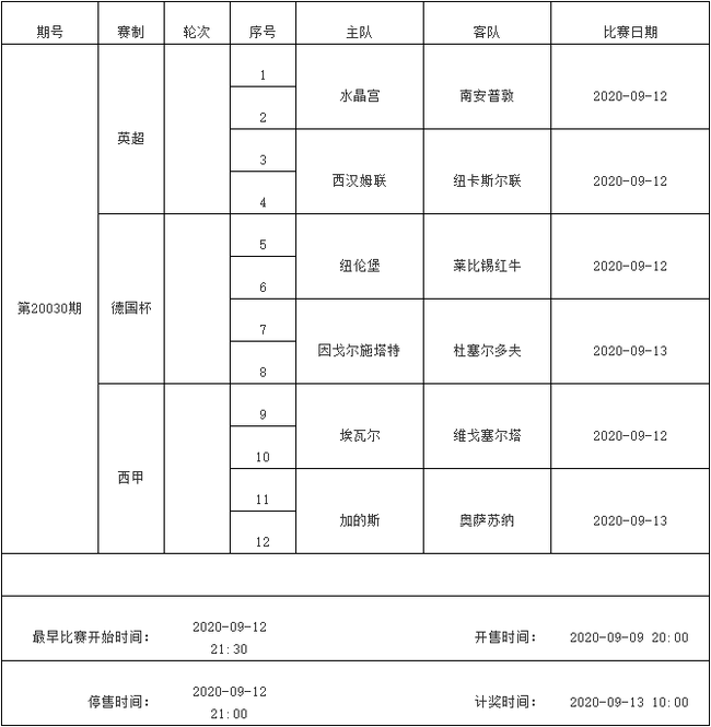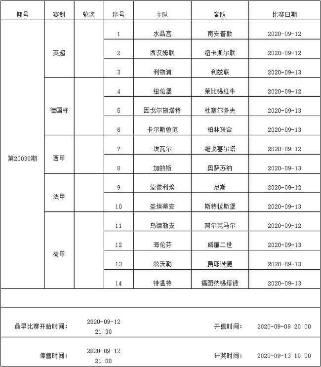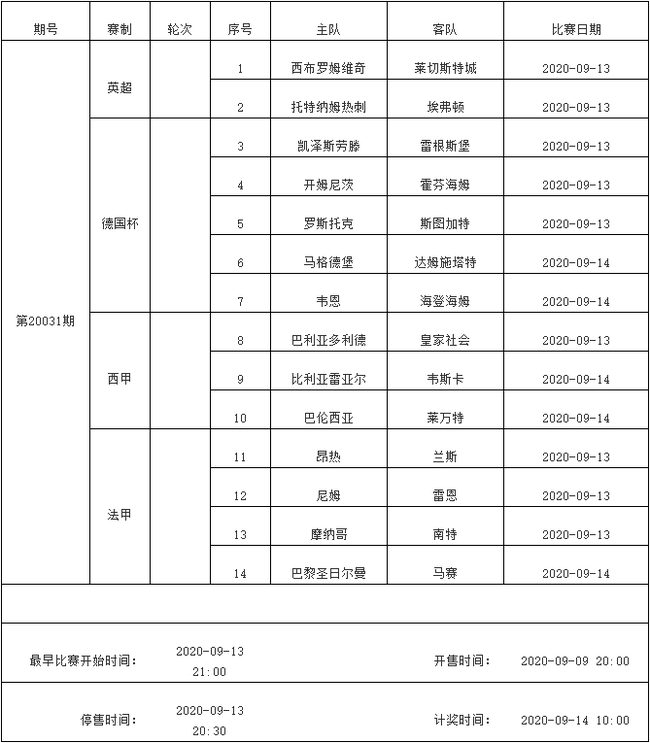 我中心制定了2020年中国足球彩票胜负游戏(14场、任选9场)、6场半全场胜负游戏和4场进球游戏9月8日-9月14日的竞猜场次安排(具体附后),其竞猜对象、开售时间、停售时间和计奖时间均以本文为准。