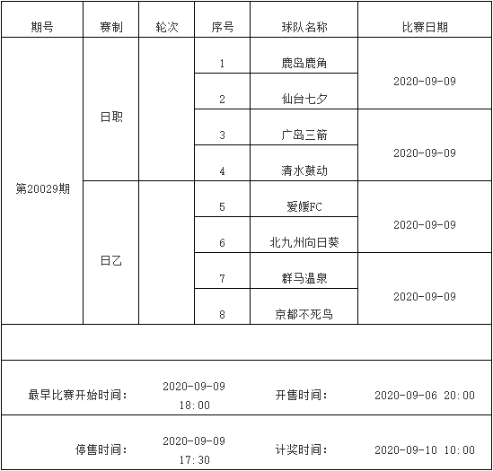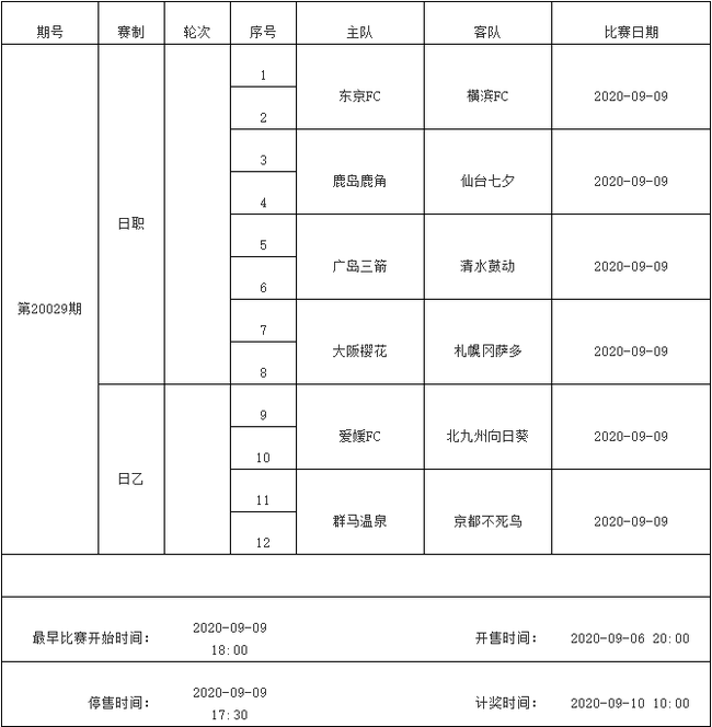 北京时间2020年9月3日,国家体彩中心公布了9月8日-9月14日足彩赛程。其中9月9日(周三)、9月12日(周六)和9月13日(周日)有三期足彩停售。值得一提的是,这三期足彩竞猜都是不跨比赛日的竞猜!9月9日停售的足彩由日职和日乙组成,而9月12日停售的足彩由英超、德国杯、西甲、法甲和荷甲足彩,9月13日停售的足彩由英超、德国杯、西甲和法甲组成。以下为具体赛程通知: