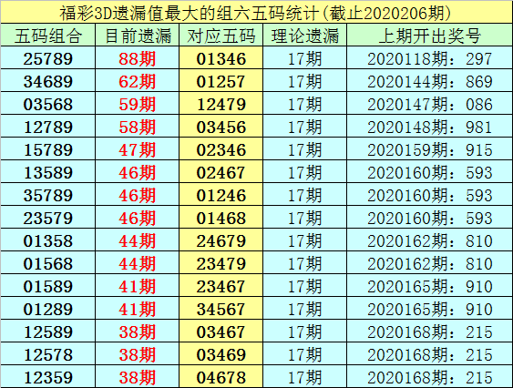 4.截止第20206期,五码组六遗漏最大的是:25789,当前遗漏88期。短期解冻的可能性较小,则20207期奖号分布在25789-01346之中的可能性最大。