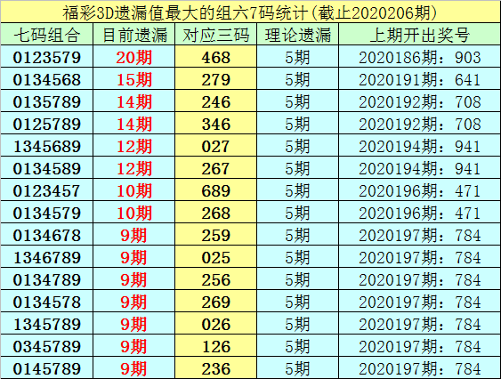 1.截止第20206期,七码组六遗漏最大的是:0123579,当前遗漏20期。