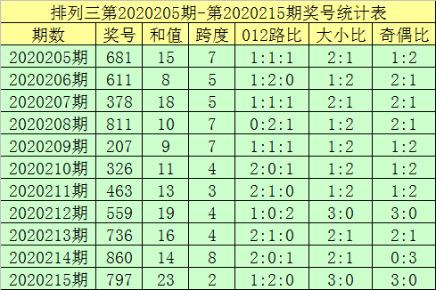 排列三第2020215期奖号开出:797,组选类型:组三,大小比为3:0,奇偶比为3:0,和值为23,跨度为2。