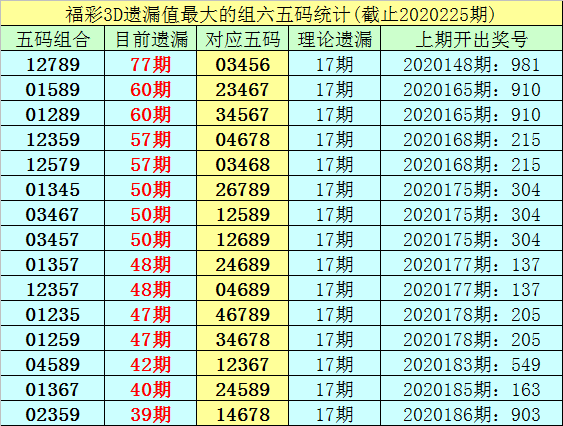 福彩3D五码遗漏组六分析(第2002001期-第2020225期)
