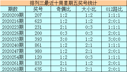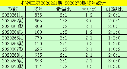 排列三第2020270期奖号为:414,其奇偶比为1:2,大小比为0:3,奖号012路比为0:3:0。