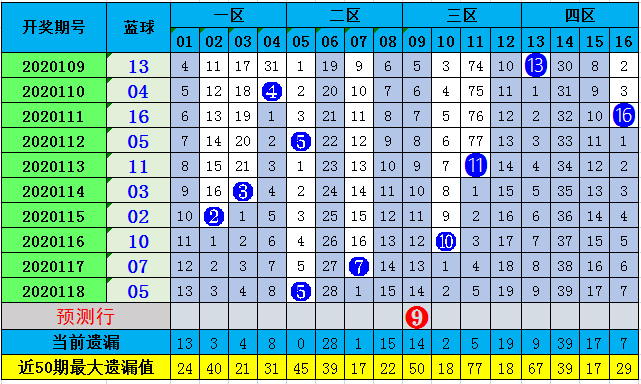 蓝球遗漏分析:(遗漏0-6期蓝球为热码,遗漏7-15期蓝球为温码,遗漏15期以上蓝球为冷码)