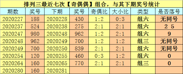奇偶分析:排列三上期奖号为160,其奇偶类型为【奇偶偶】,最近七次出现奇偶类型奇偶偶的号码分别为:188、524、980、962、700、120、160,其下期奖号分别为:188、524、980、962、700、120、160。其中号码奇偶比为9:12,奇偶奖号开出比例基本平衡,本期看好偶数号码转热,注意奇偶比1:2出现。