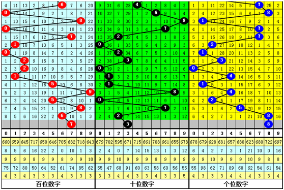 从以上统计可以看出,在组选分布图中,号码0开出14次,1开出13次,2开出11次,3开出14次,4开出10次,5开出14次,6开出11次,7开出13次,8开出15次,9开出11次,号码奇偶比为65:61,奇号走势活跃,本期预计奇号继续走热,奇偶比为2:1;号码大小比为:64:62,大小号码基本相当,本期看好大号转热,大小比参考2:1。