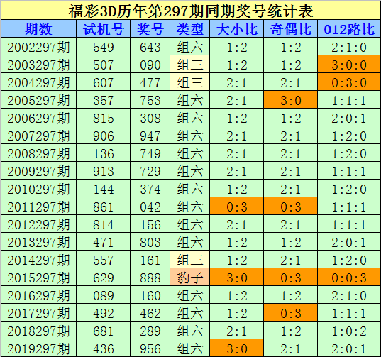 组选类型判断:在第297期历史同期开奖中,组六开出14次,组三开出3次,豹子开出1次,今年同期防开出组三号码。