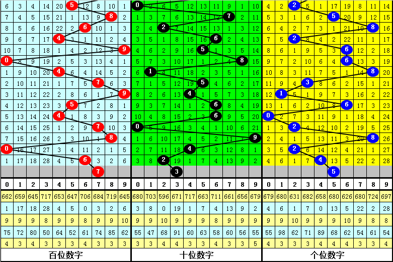 一、在下期开奖中,百位号码奇偶比为3:4,大小比为4:3,012路比为2:4:1,本期百位注意号码:3、4、7,胆码看好奇号:7。