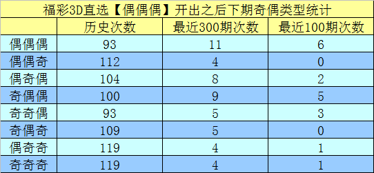 前7次出现偶偶偶类型奖号分别为:068、200、628、462、086、460、042,其下期分别开出奖号:891、114、462、956、418、702、624。