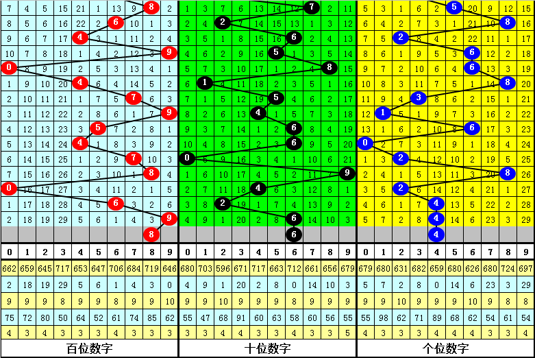 百位:2020295期-2020299期出号:78069,振幅为9点,分布比较分散,本期看好百位走小,关注8。