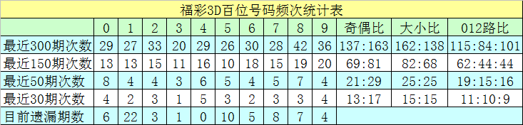 十位分析:前50期出号频次较高的号码为:6开出8次,0、2、4开出7次;出号频次较低的号码为:3开出1次,1、5开出3次。该位号码大小比为25:25,012路比为22:14:14。本期该位排除两码2、8,注意号码3、7、9,精选一码3。
