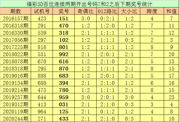 百位号码:连续两期百位出号分别为:7-2,历史上福彩3D连续两期前后分别出号7-2的奖号共出现74次。在百位7-2的奖号现象出现时,近15期下期分别出号:151-470-318-102-801-992-616-870-683-394-780-959-031-125-433;
